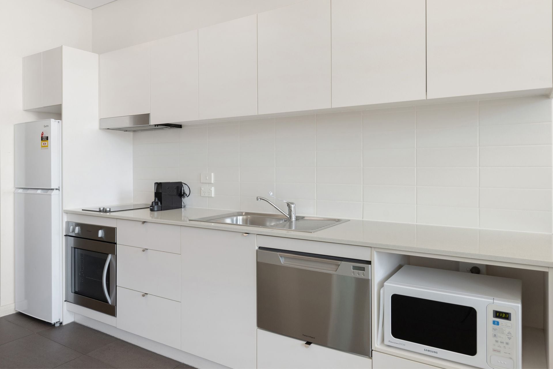 – Single line kitchen with electric cooktop, under bench oven, dish drawer