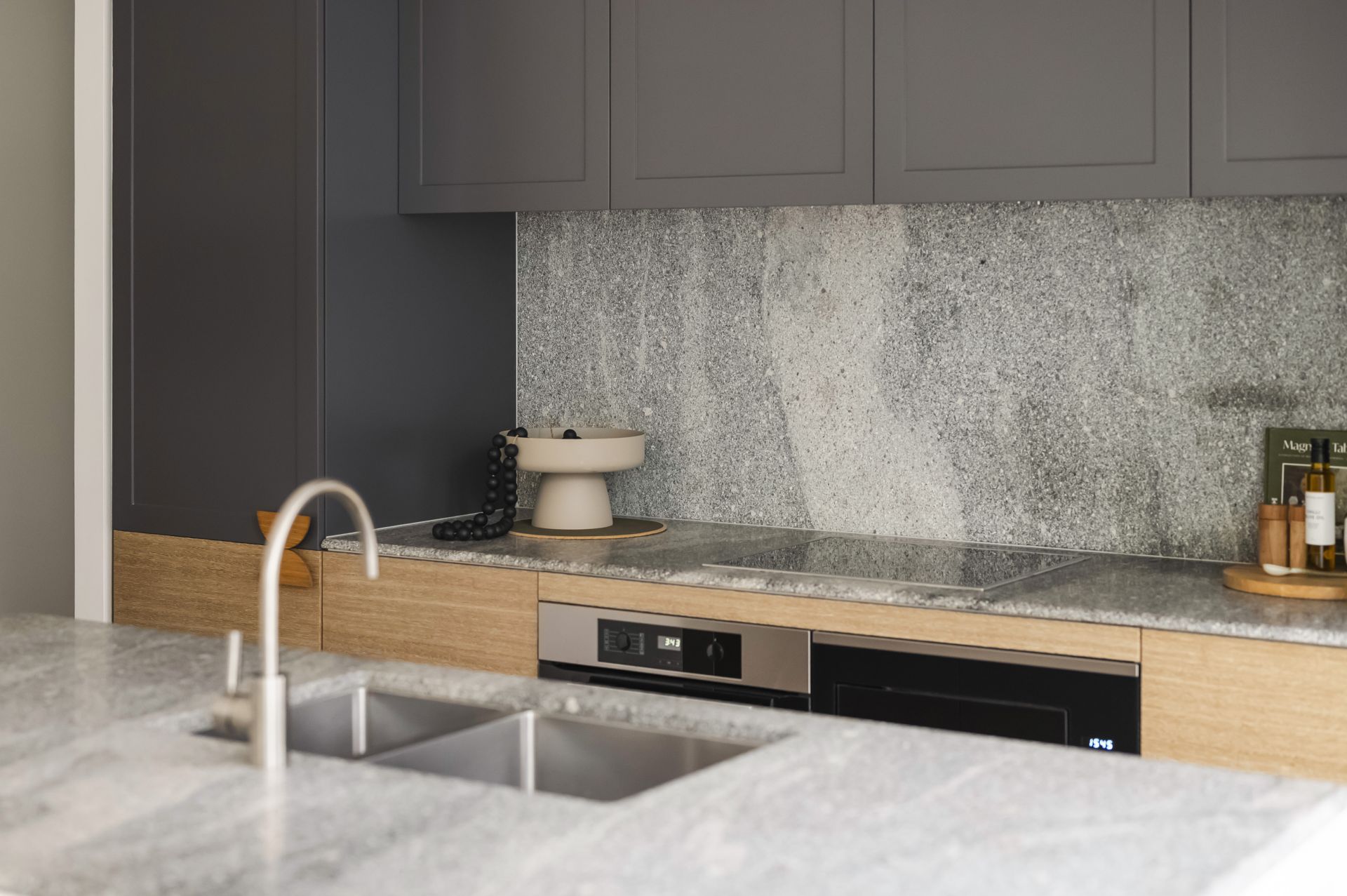 – Immaculate kitchen flaunts stone benches and backsplash, an island breakfast bar and quality Miele appliances inc. induction cooktop, microwave, integrated dishwasher and integrated fridge/freezer