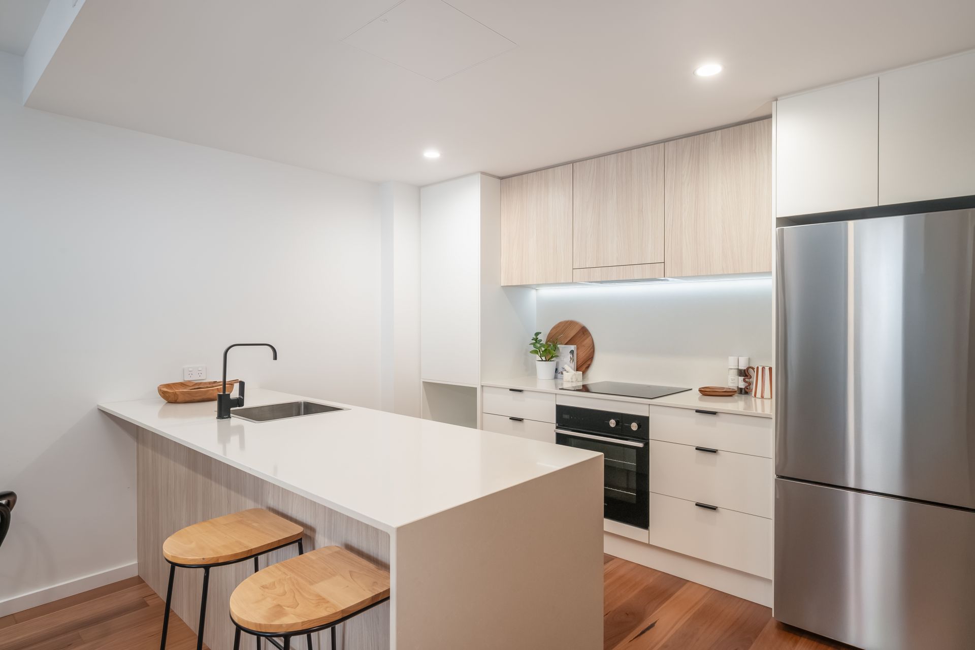 – Caesarstone benchtops, Fisher & Paykel cooking appliances, integrated dishwasher
