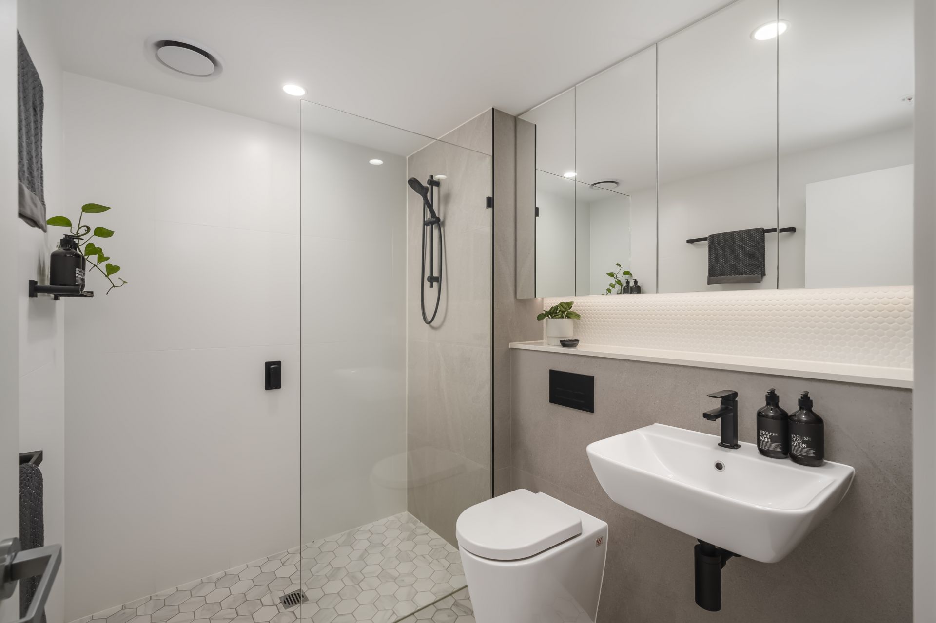 – Bathroom with black tapware, face-level storage, and in-wall toilet, Euro laundry