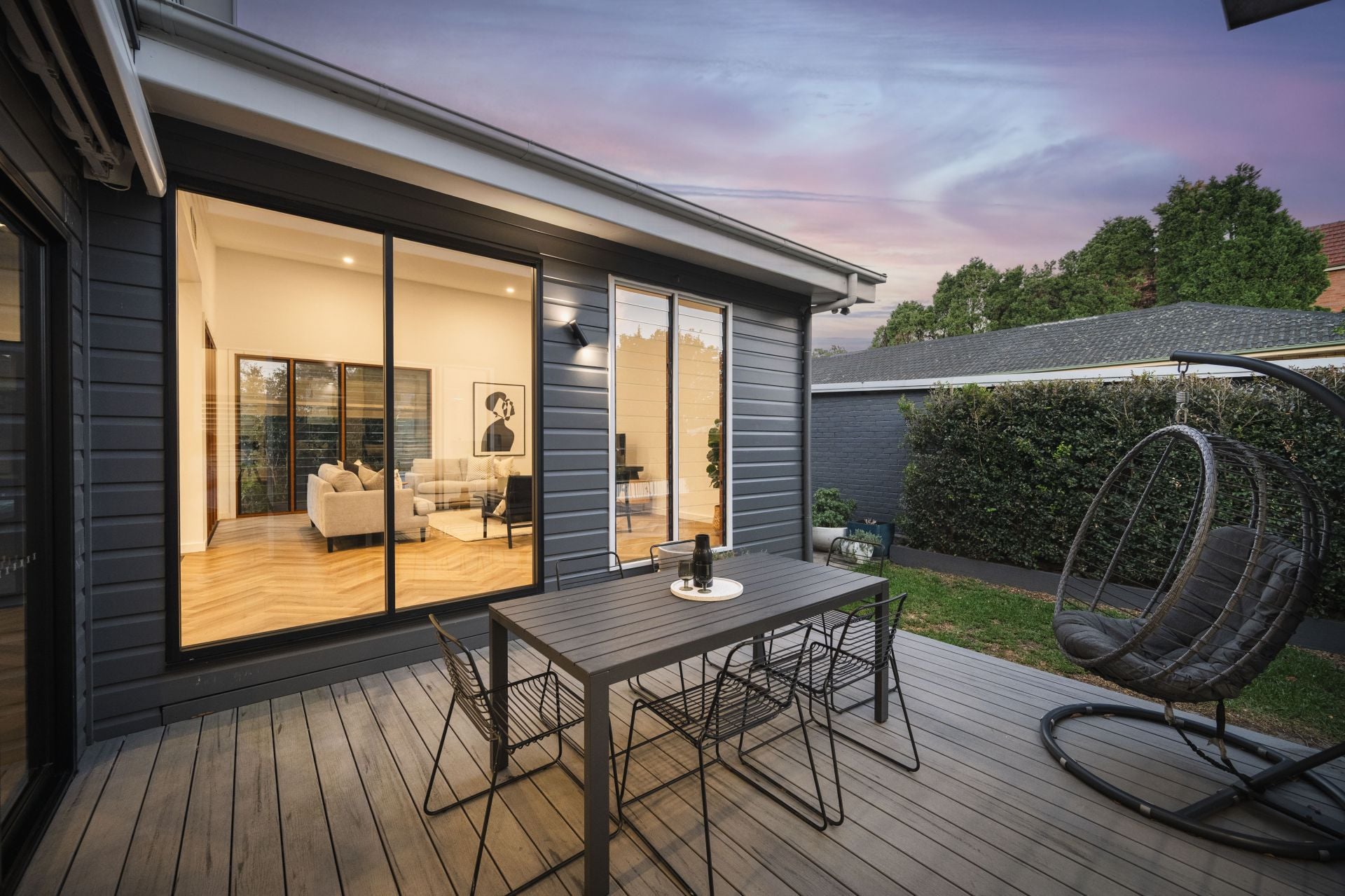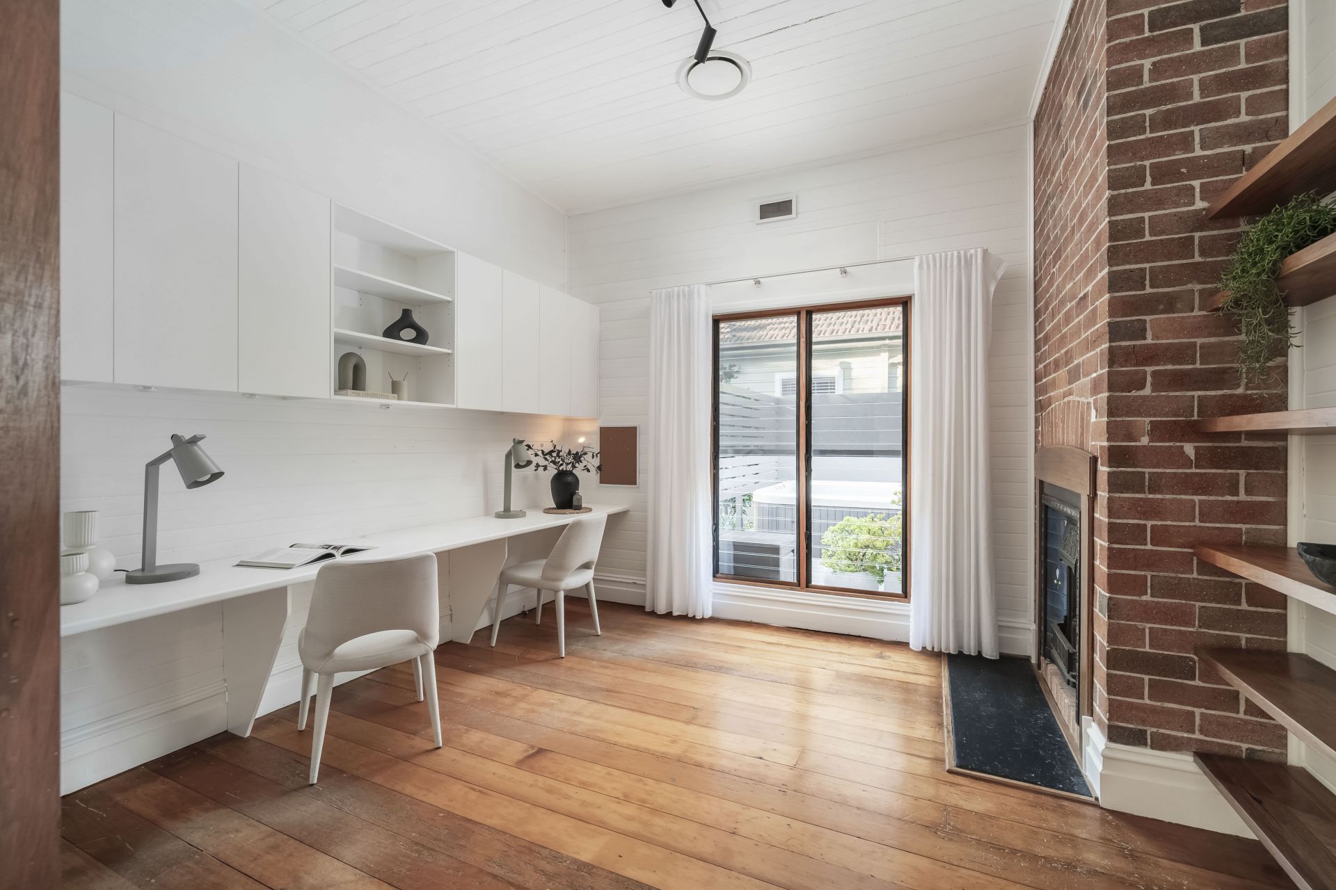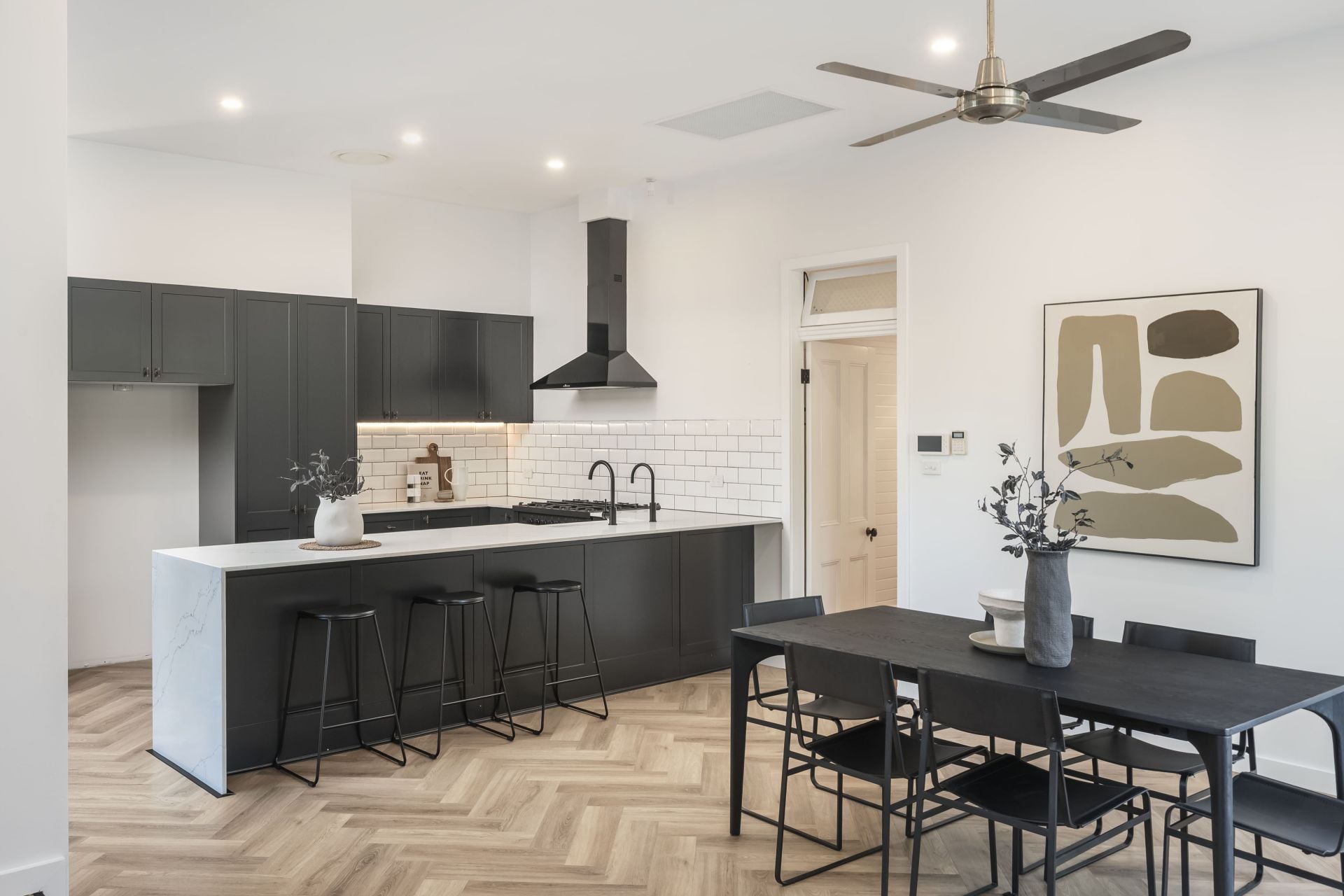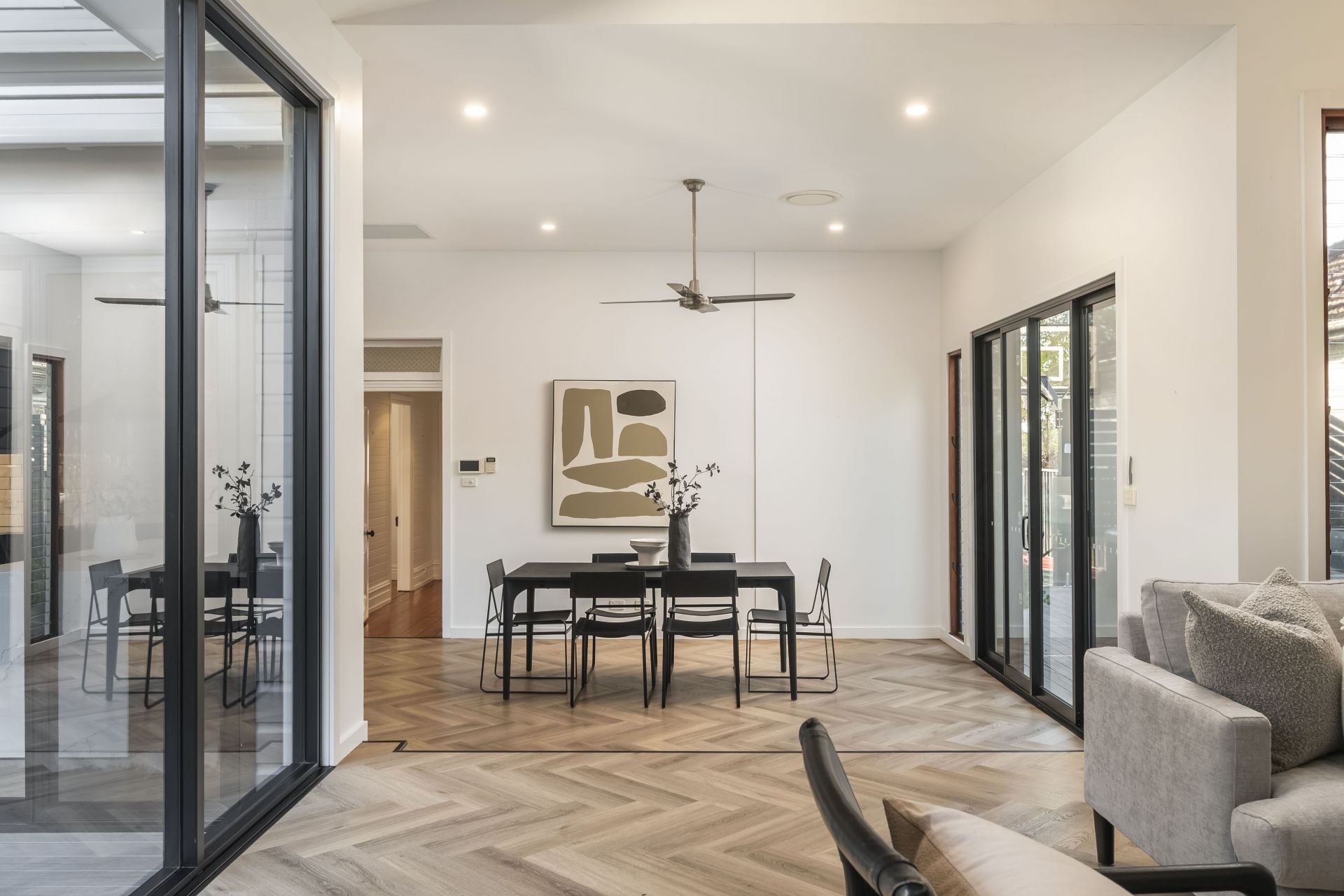 Four generous bedrooms continue the theme, balanced by a renovated family bathroom and a sky-lit master ensuite that leans into hotel-level indulgence with heated marble floors, walk-in shower and a freestanding bath. At the rear, the home opens up into a contemporary living, dining and kitchen zone that couldn’t feel more current. Herringbone floors draw your eye through the room, while the navy kitchen, complete with Ilve gas stove and butler sink, feels both refined and easy-going. A dedicated office with custom desk adds flexibility as an extra living area, while creature comforts like ducted air, louvre windows and electric gated parking elevate daily life. A pull down attic ladder into carpeted and lined space offers further potential.