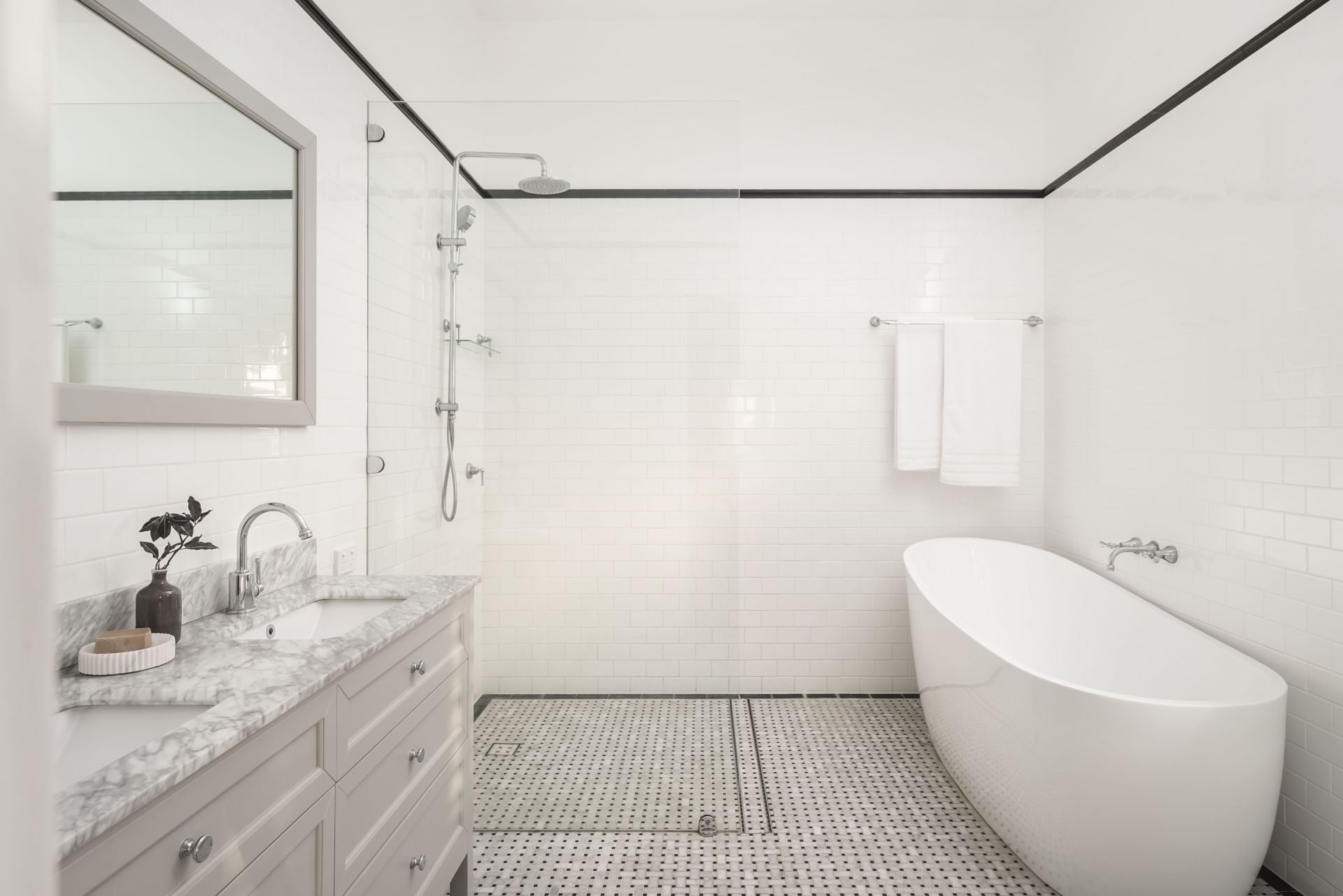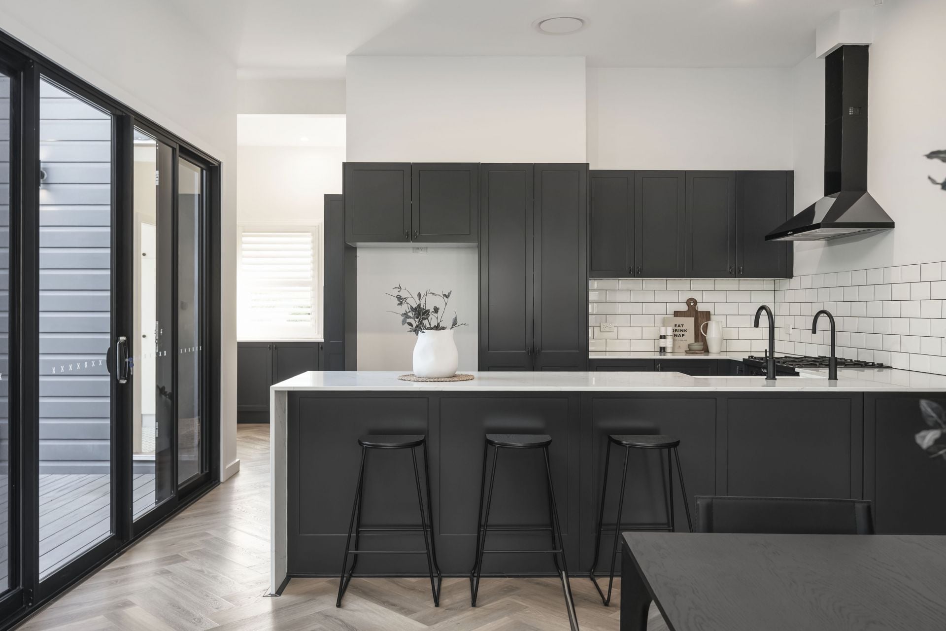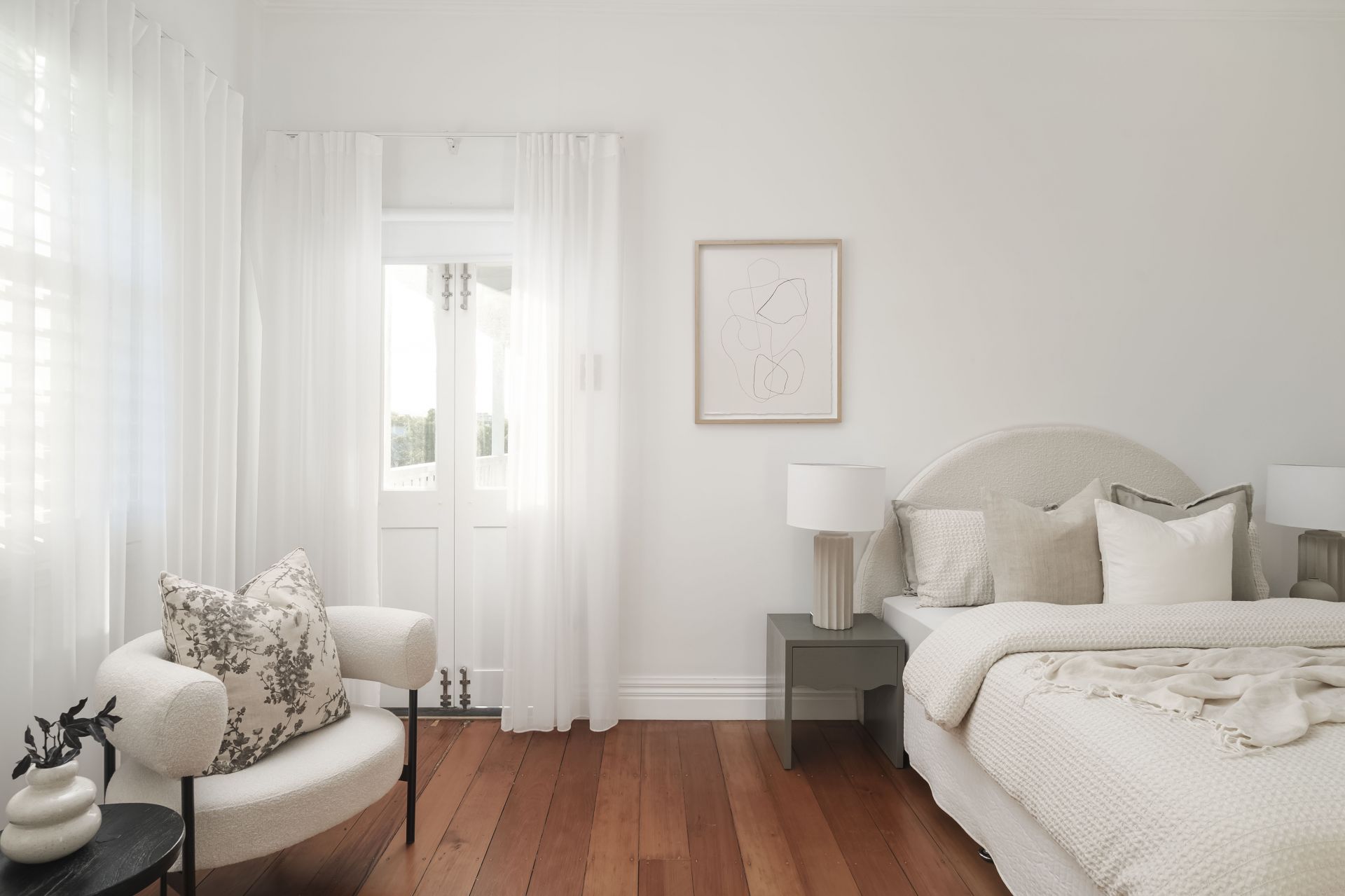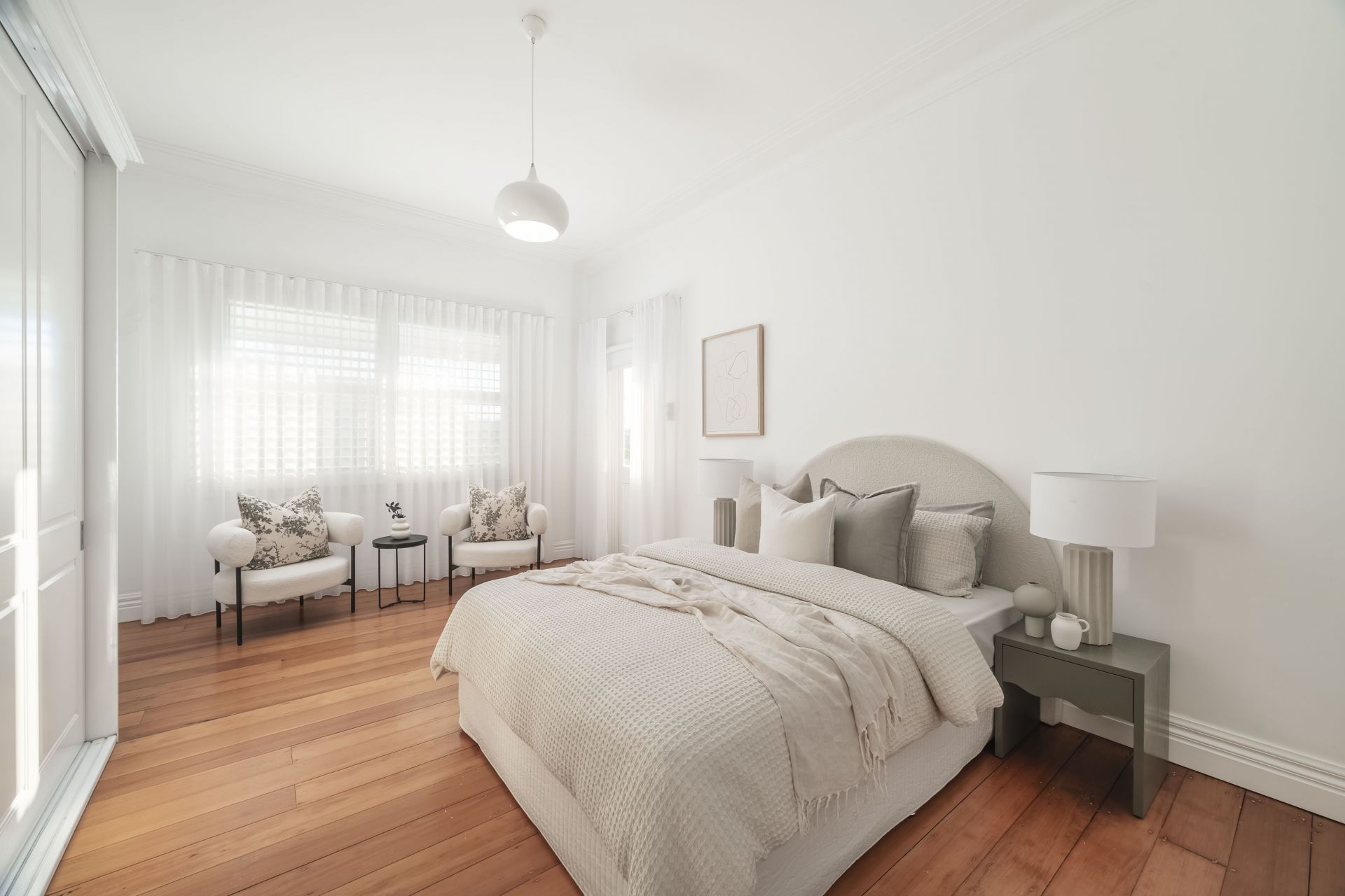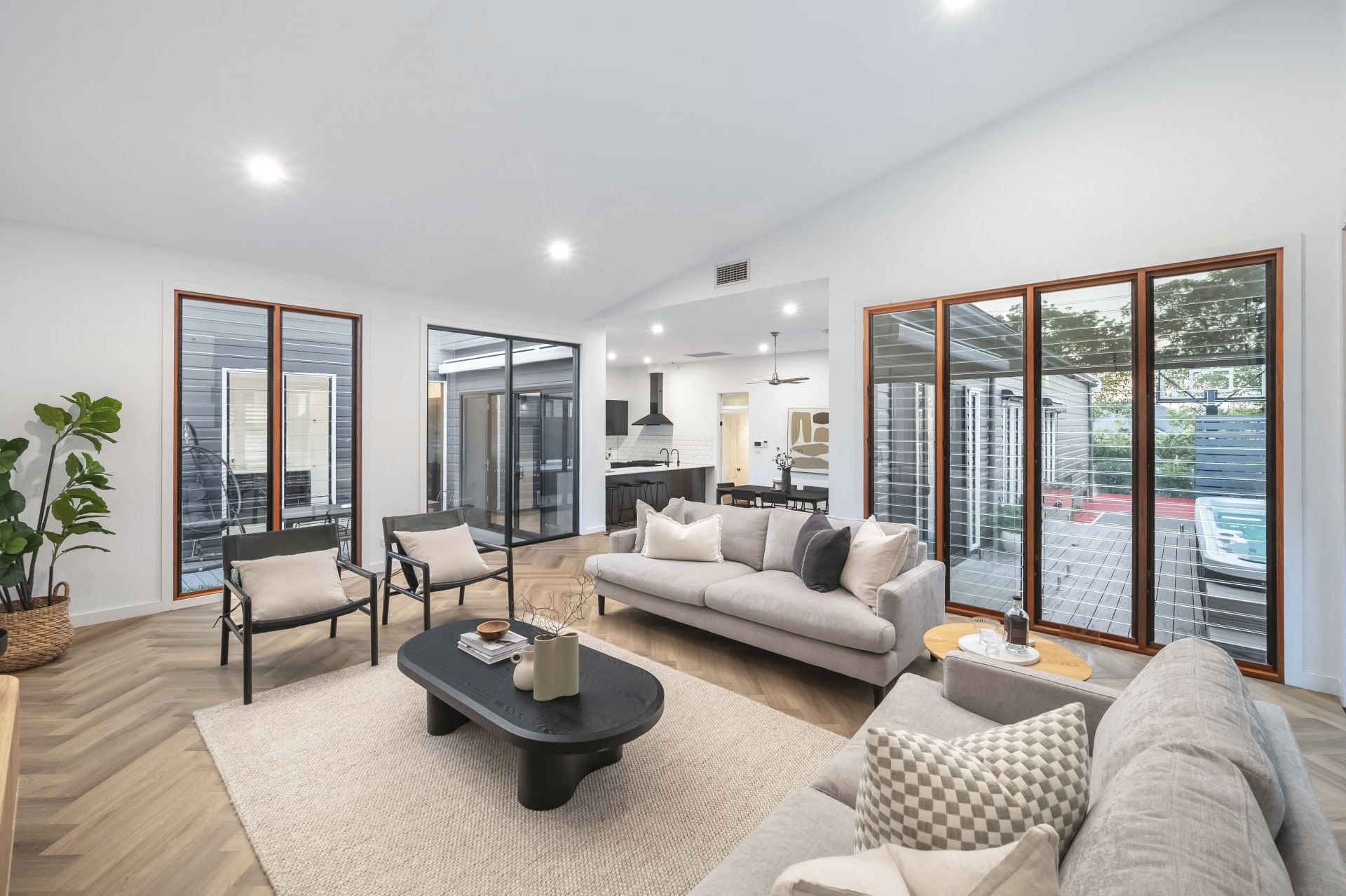 Four generous bedrooms continue the theme, balanced by a renovated family bathroom and a sky-lit master ensuite that leans into hotel-level indulgence with heated marble floors, walk-in shower and a freestanding bath. At the rear, the home opens up into a contemporary living, dining and kitchen zone that couldn’t feel more current. Herringbone floors draw your eye through the room, while the navy kitchen, complete with Ilve gas stove and butler sink, feels both refined and easy-going. A dedicated office with custom desk adds flexibility as an extra living area, while creature comforts like ducted air, louvre windows and electric gated parking elevate daily life. A pull down attic ladder into carpeted and lined space offers further potential.