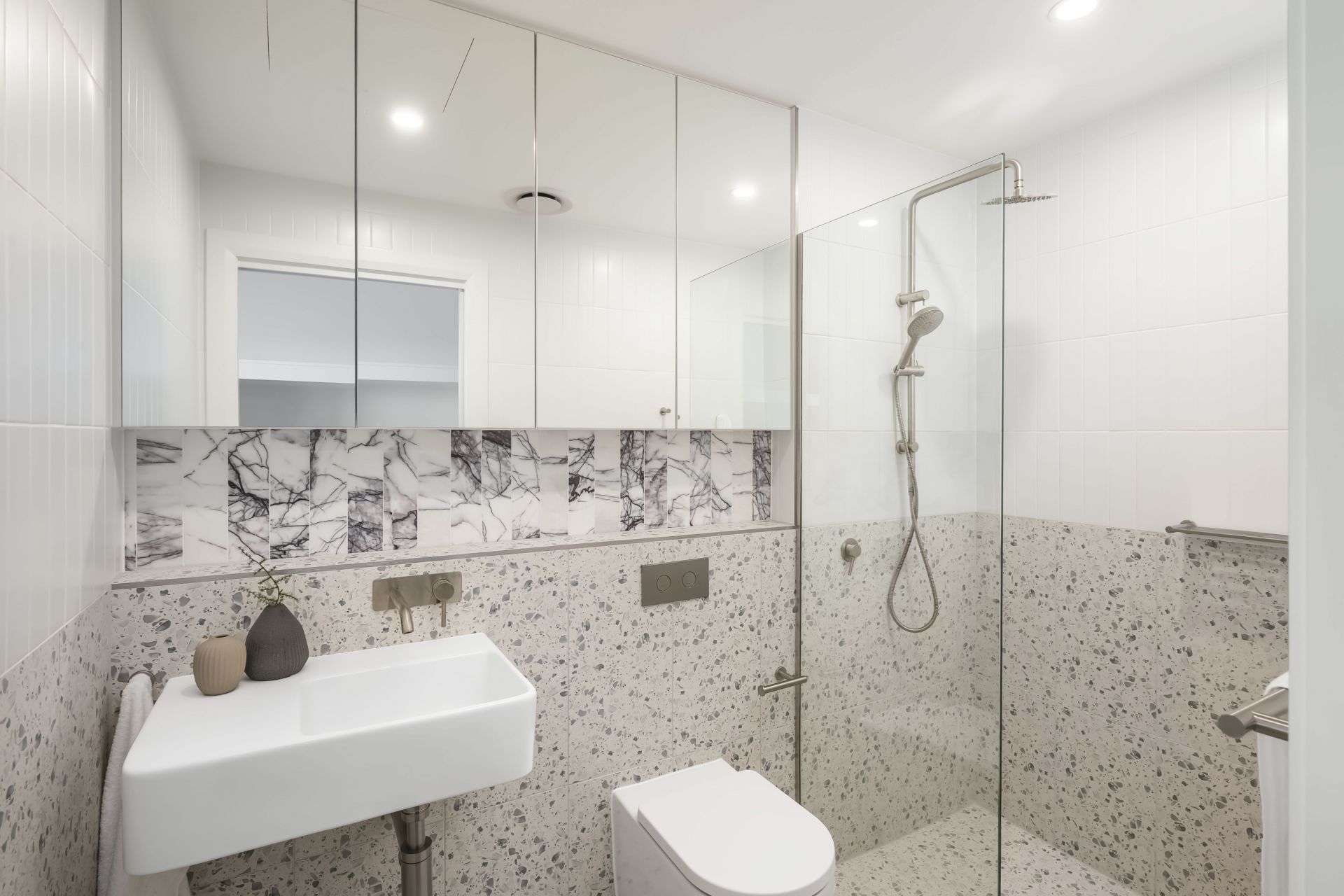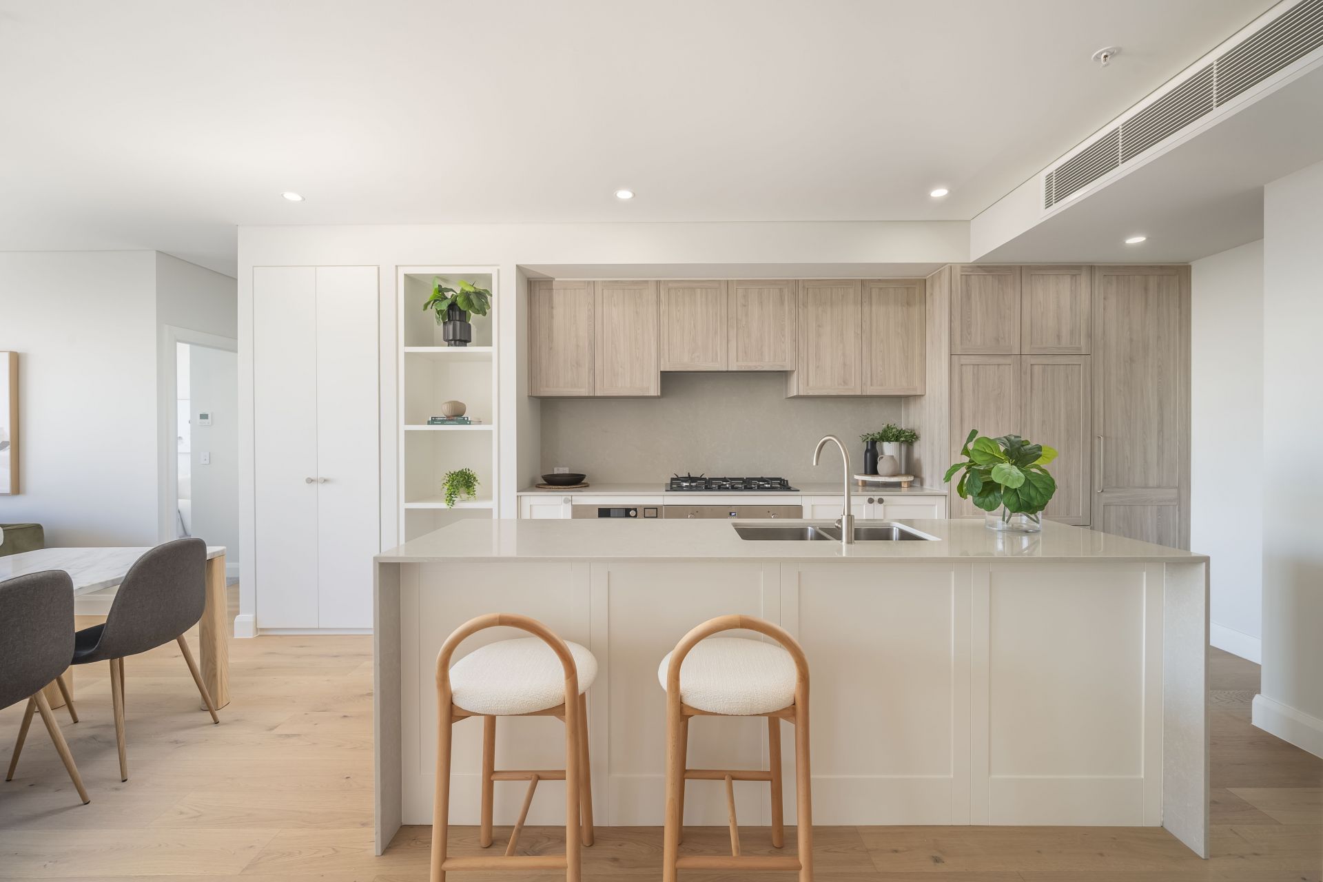 Every principal room spills onto the full-length terrace, where some of Newcastle’s landmarks become part of the backdrop including the Obelisk, the heritage Post Office, and ships sailing into port. It’s the kind of space that invites slow mornings with coffee, long lunches, or an easy wine at sunset while the city hums below. The interior aesthetic is calm, considered, and beautifully finished. Engineered timber floors run through the living area, while the island kitchen takes centre stage with shaker cabinetry, stone benchtops, Ilve appliances, and an integrated Fisher & Paykel fridge/freezer. Two bedrooms enjoy walk-in robes and private ensuites, with the third serviced by a separate bathroom, all finished to the same high standard with full-height tiling, frameless glass showers, face-level storage, and in-wall toilets. A dedicated laundry keeps everything neatly tucked away. Sharing the penthouse level with just three other residences, the apartment feels private, elevated, and quietly exclusive. Secure lift access and two parking spaces plus a storage cage complete the picture.
