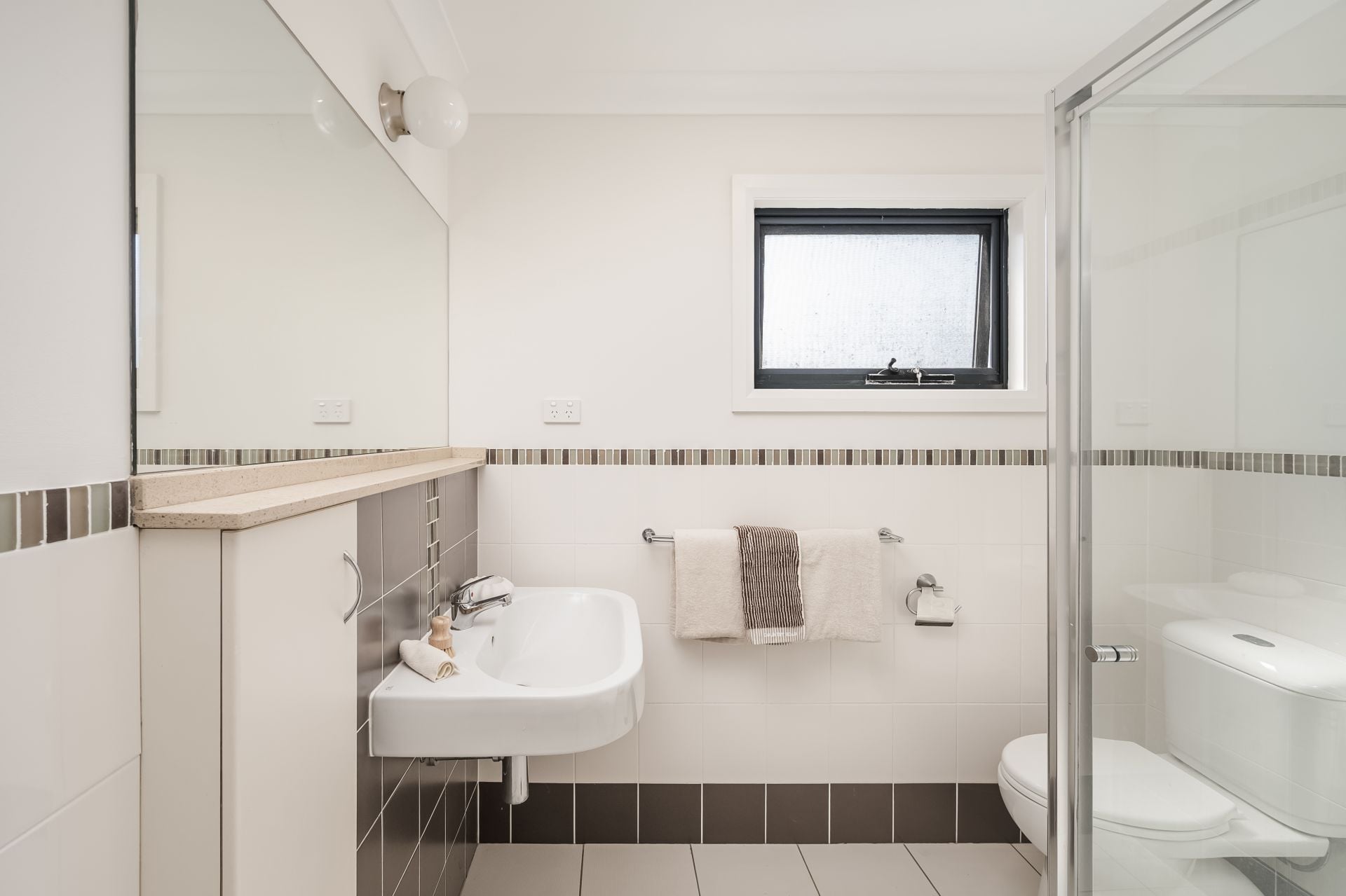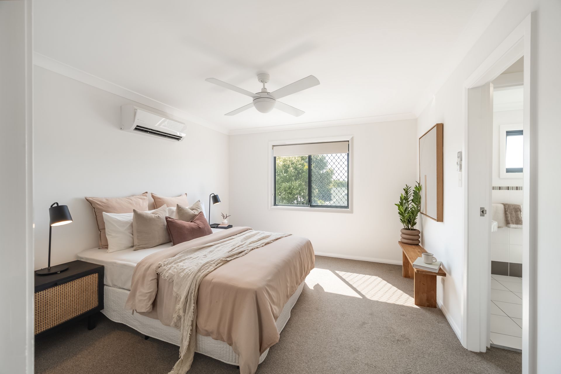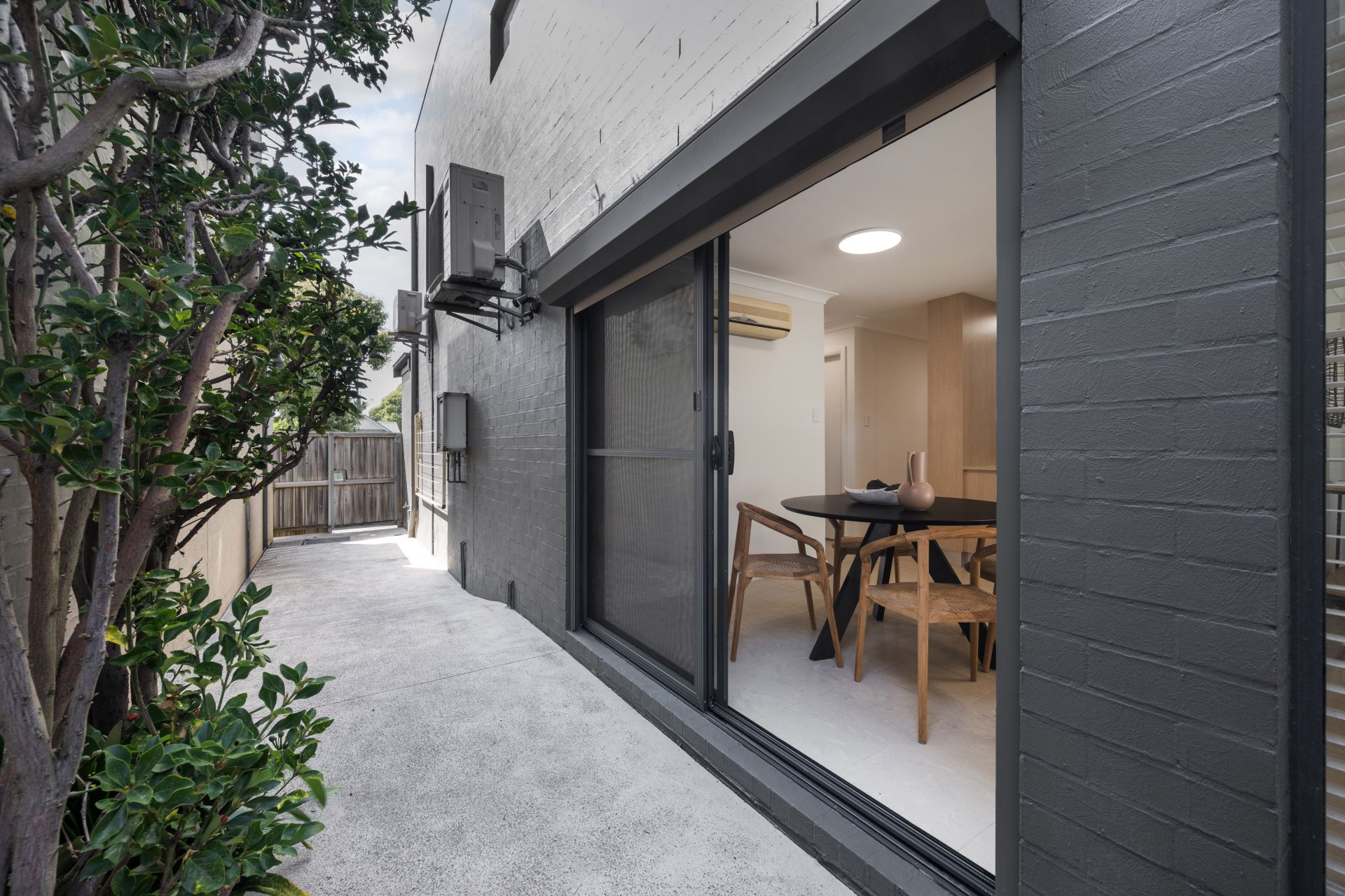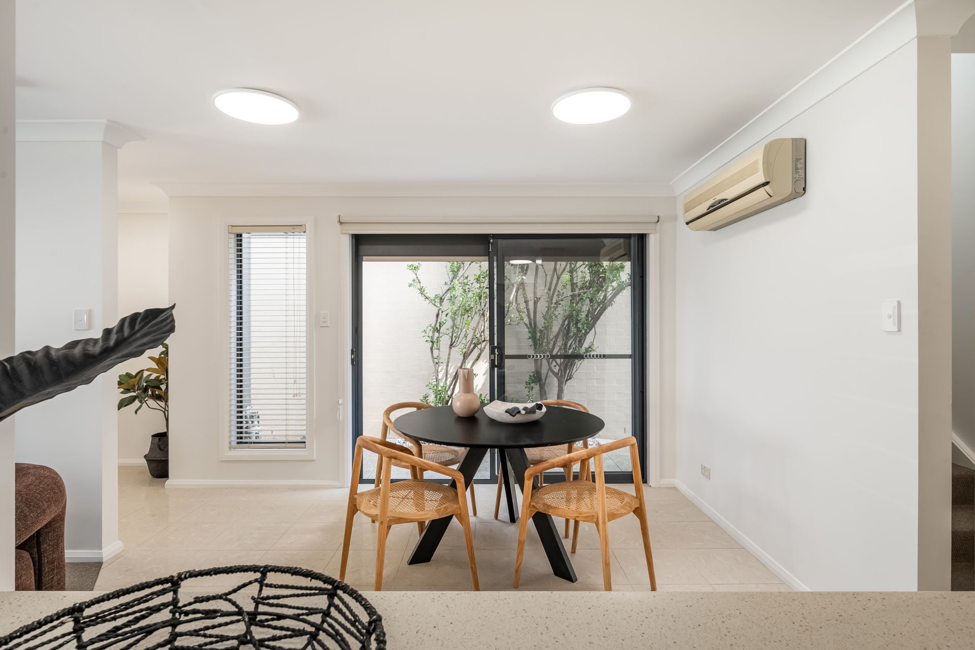 A sunlit courtyard sets the tone on arrival, creating a private outdoor retreat for morning coffee or an evening unwind. Freshly painted inside and out, with new lighting adding a crisp finish, the home feels refreshed and ready to go. Open plan living and dining flows easily to the courtyard through glass sliders, with air conditioning keeping things comfortable year-round. The stone-topped kitchen with gas cooking sits neatly to one side, while a full laundry with handy third w/c and internal access to the double garage rounds out the ground floor. Upstairs, two bedrooms are serviced by two bathrooms. The main enjoys its own a/c and elevated district outlook, while the second incorporates a study zone that could be enclosed to create a compact third bedroom if needed.