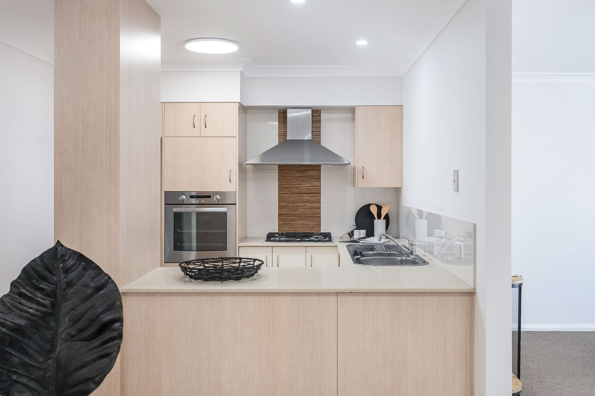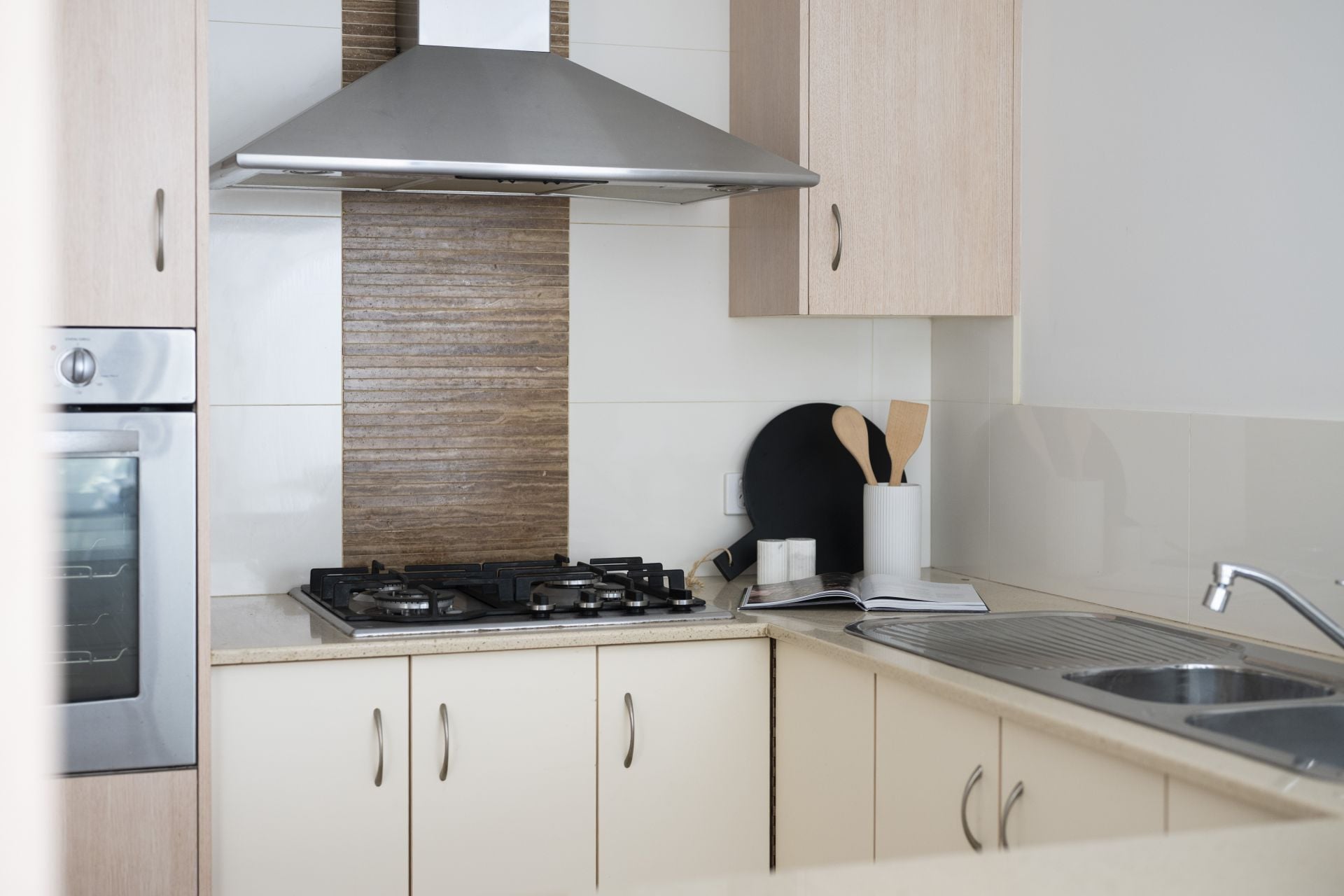 – Kitchen with stone benches, gas cooktop, wall oven